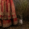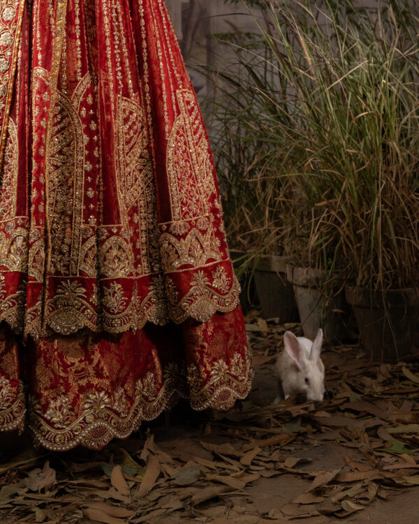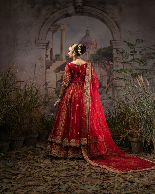 The outfit is meticulously hand-embellished, showcasing the finest craftsmanship. The hand-loomed khaddi silk shirt adds rich texture, paired with a brocade lehnga and a silk farshi, creating depth and grandeur in every layer. Completing the look is a 4-yard dupatta crafted from pure tafta silk net, delicately adorned with intricate detailing for a truly royal finish.